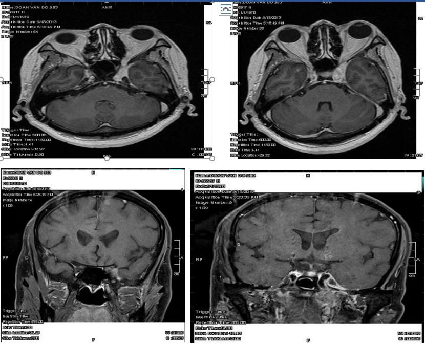 Tóm tắt bệnh án: Bệnh nhân nam, 43 tuổi, nhập viện vì sưng đau hốc mắt (T) Bệnh 1 năm, tái phát nhiều lần. Liệt các dây sọ (T): III, IV, VI, giảm cảm giác nông thuộc vùng chi phối V1, V2