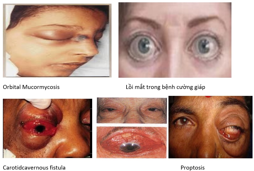 Các triệu chứng thường gặp của bệnh ở hốc mắt: Sưng phù mi mắt, mắt lồi và nhìn (song thị). Đôi khi có kèm theo cả đau nhức và giảm thị lực. (Trong đó, lồi mắt và hạn chế vận nhãn là dấu hiệu chính)