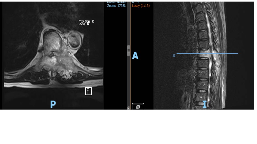 Thâm nhiễm tủy xương đốt sống ngực T8 lan ra mô mềm xung quanh và vào ống sống chèn ép tủy