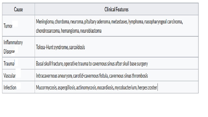 Căn nguyên của hội chứng xoang hang: (1) Khối u: u màng não có thể phát sinh từ mô màng cứng. U sợi thần kinh có thể phát sinh từ chính dây thần kinh. U tuyến yên và ung thư biểu mô vòm họng có thể xâm lấn vào xoang hang bằng cách mở rộng cục bộ. Di căn từ phổi và vú cũng có thể xảy ra. (2) Huyết khối: thường do nhiễm trùng ở các xoang hoặc hốc mắt cạnh mũi. Dịch não tủy bình thường trừ khi nhiễm trùng lan đến màng não. Có thể do trạng thái tăng đông. (3) Bệnh viêm nhiễm: Hội chứng Tolosa Hunt: bệnh u hạt vô căn của xoang hang. BN có biểu hiện đau nhức mắt. Chẩn đoán được thực hiện trên lâm sàng với ESR tăng và MRI tìm thấy tăng tín hiệu trong xoang hang. Sarcoidosis: bệnh đặc trưng bởi sự phát triển của các tập hợp nhỏ các tế bào viêm (u hạt) ở bất kỳ bộ phận nào của cơ thể – phổ biến nhất là phổi và các hạch bạch huyết. Nhưng nó cũng có thể ảnh hưởng đến mắt, da, tim và các cơ quan khác. (4) Phình động mạch cảnh và lỗ rò. (5) Chấn thương