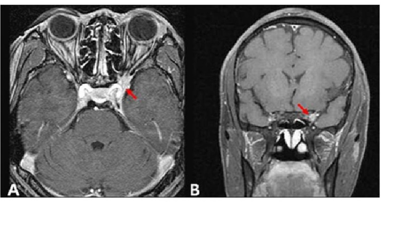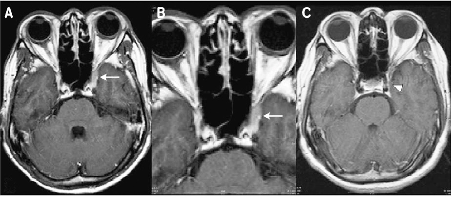 Hình ảnh Gadolinium-enhanced T1-weighted axial (A) và coronal (B) cho thấy một khối tăng cường liên quan đến xoang hang trái. Hình ảnh Gadolinium-enhanced T1-weighted axial (C) sáu tháng sau khi điều trị bằng steroid