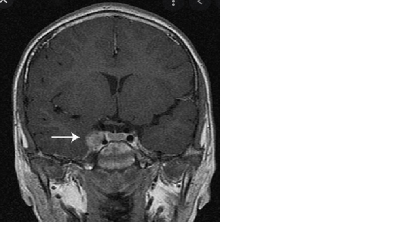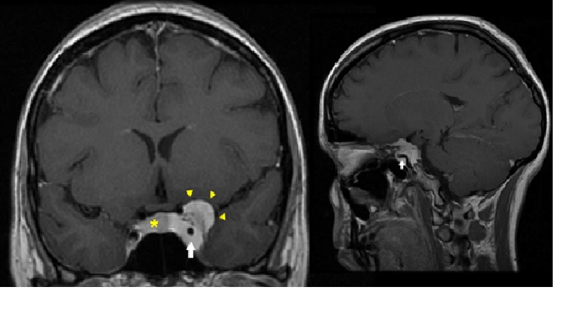 MRI T1W sau cản quang, coronal (left) và sagittal (right, scaled down). Lưu ý sự tăng cường đồng nhất của khối u chiếm và nhô ra qua thành bên của xoang hang trái. Đầu mũi tên màu vàng cho thấy một phần nhỏ ngoài hang. Động mạch cảnh trong bị hẹp và di lệch được bao bọc (mũi tên trắng). Tuyến yên bị đẩy sang phải (dấu sao vàng).