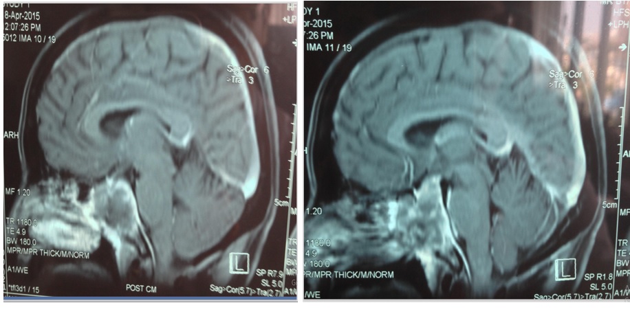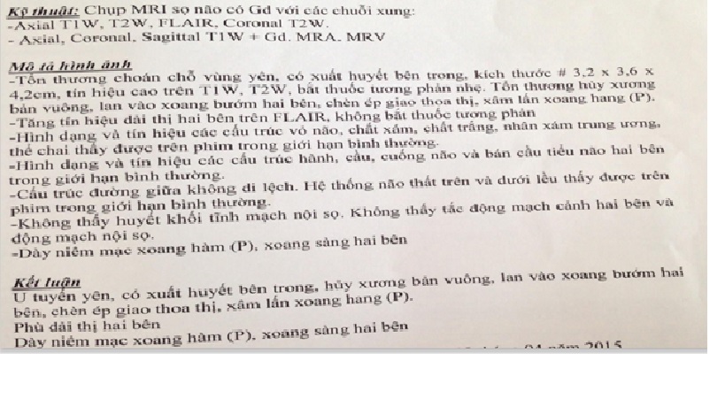 Bệnh nhân, nữ 45 tuổi (1970), Địa chỉ: Vũng Tàu, Nghề nghiệp: Giáo viên, Dân tộc: Kinh Nhập viện: 22/04/2015 Lý do: đau đầu. Sáng ngày 21/04/2015 7h45’ bệnh nhân được gây mê nội soi buồng tử cung để cắt đốt polyp nhân xơ, Cùng ngày sau khi tỉnh dậy bệnh nhân than đau đầu dữ dội vùng đỉnh đầu, giữa trán lệch về bên phải, đau từng cơn kéo dài khoảng 2-3 tiếng, không tư thế giảm đau, kèm chóng mặt, bệnh nhân được dùng thuốc giảm đau nhưng không bớt. Đến tối cùng ngày bệnh nhân sụp mi mắt phải, đau đầu ngày càng nhiều hơn nên được chuyển tới Bv Chợ Rẫy. Tiền sử bản thân: – PARA 2002 – Không ghi nhận bệnh lý nội khoa – Chưa từng đau đầu nhiều như vậy – Nội soi mổ nhân xơ 2. Gia đình: – Chưa ghi nhận bất thường