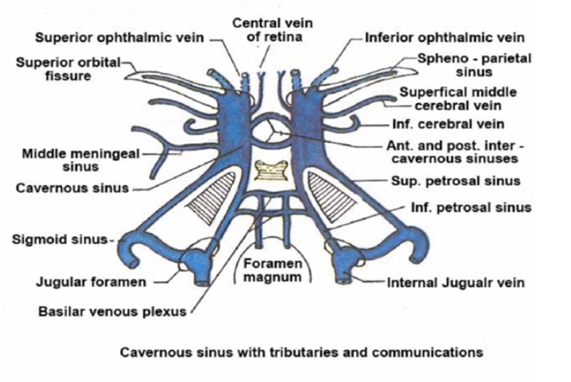 Xoang hang là một khoảng xoang tĩnh mạch bao gồm màng cứng. Nó nhận máu tĩnh mạch từ các tĩnh mạch mắt trên và dưới và dẩn lưu qua sphenoparietal sinus, superior petrosal sinus, basilar plexus (dẫn lưu đến inferior petrosal sinus), và pterygoid plexus. Các xoang hang bên phải và bên trái được nối với nhau . Vì vậy, một quá trình bệnh có thể lây lan từ bên này sang bên kia và gây ra các triệu chứng hai bên.