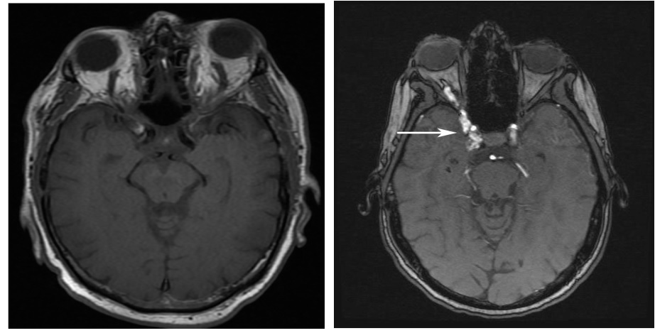 Chỉ định MRA nếu nghi ngờ có phình mạch và huyết khối. Nó có thể cho thấy dòng chảy giảm hoặc không có trong phần hang của động mạch cảnh (decreased or absent flow in the cavernous portion of carotid artery)
